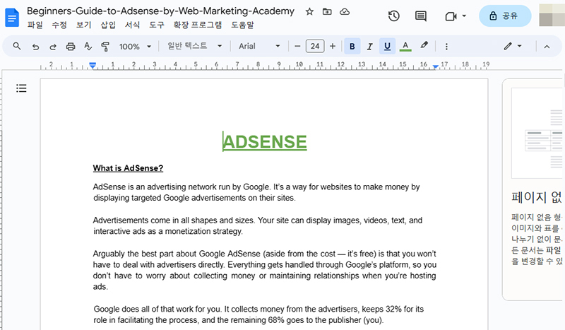 구글 문서로 열면 다음과 같은 화면을 볼 수가 있습니다. 여기까지 잘 따라오신 분들은 어렵지 않게 해당 화면을 볼 수가 있습니다.
