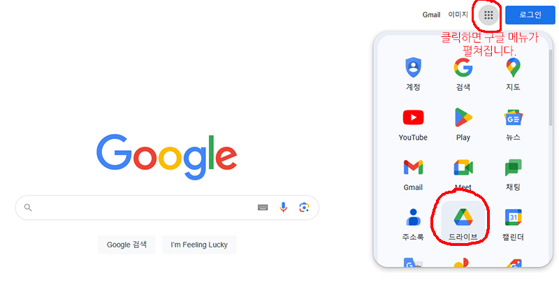 구글에 접속하여 로그인 버튼 옆에 위치한 화면에서 표시한 빨간색 동그마리를 클릭하면 구글 서비스 메뉴가 펼쳐지는데 여기서 구글 드라이브를 선택하거나 아래에 구글 드라이브 바로가기 링크를 제공해드렸으니 버튼을 클릭하여 빠르게 접속하시면 됩니다.