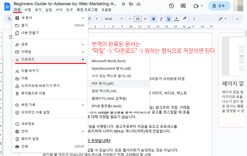 4. 구글 문서로 가져온 PDF파일을 한국어로 번역하기