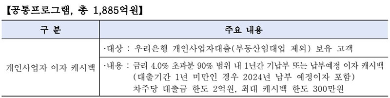 ※ 이번 소사공인 민생금융 지원 프로그램은 은행연합회를 중심으로 모든 은행이 참여하여 자영업자, 소상공인에게 이자를 환급해주는 공통프로그램과 5대 시중은행을 기준으로 은행 자체적으로 금융취약계층을 지원하는 자율 프로그램으로 나뉘어 진행됩니다. 우리은행에서는 공통프로그램으로 1885억원, 자율 프로그램으로 873억원을 지원할 계획입니다.