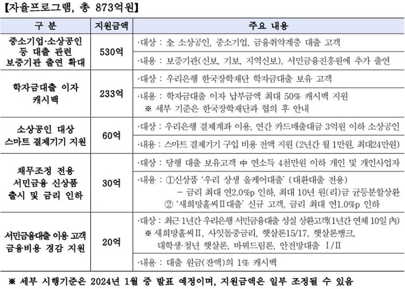 - 우리은행은 873억원 규모의 자율 프로그램 지원 방안 발표