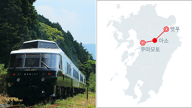 동심을 자극하는 아이들을 위한 꿈의 열차, 열차의 상징인 검은 강이지 캐릭터의 '쿠로짱'이 마중 나옵니다. 세계 최대 규모의 아소 칼데라를 통과하는 관광 열차로 파노라마 좌석에 앉아 경치를 관람할 수 있는 게 특징입니다.