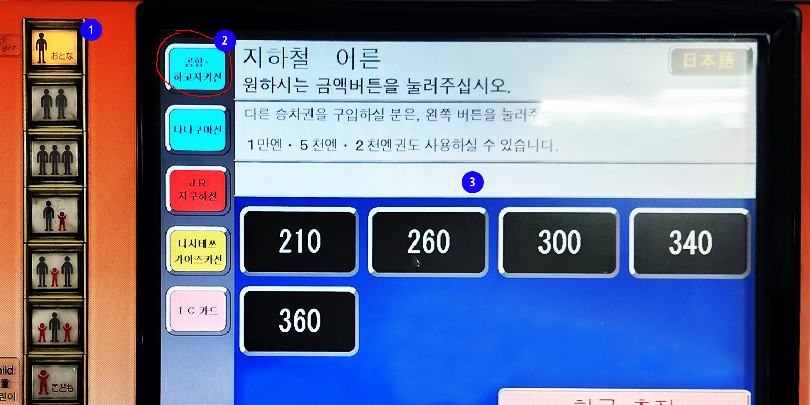 무인발권기는 한국에서 이용하는 발권기와 동일하며, 한국어도 지원을 하고 있어 편리하고 쉽게 발권이 가능하며, 거스름돈도 지폐와 동전 모두 발권기에서 받을 수 있어서 고액권의 지폐도 사용이 가능합니다.