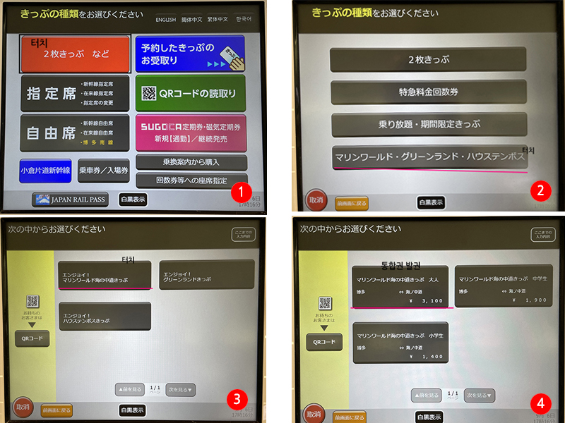 JR선 왕복 기차표와 마린월드 입장권을 할인 받아 구매하는 방법으로 하카타역에서 해당 통합권을 구매할 수 있습니다.