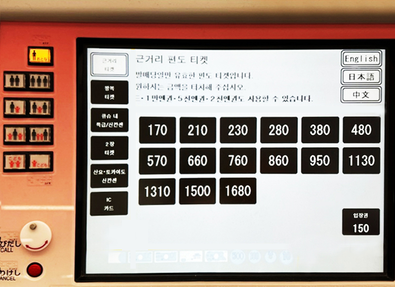 지하철 티켓 발권처럼 역을 기준으로 발권하는 방식이 아니니 처음 해보면 익숙치 않아 어려움을 느낄 수 있으나 방법을 알면 쉽게 가능합니다. 2번 전광판에서 내가 가는 역의 요금을 확인 후 요금을 기준으로 발권합니다.