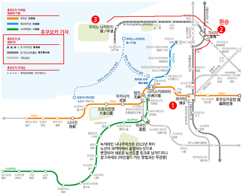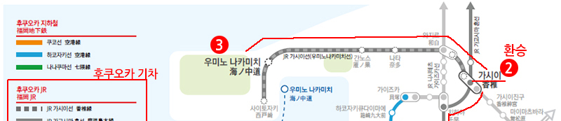 후쿠오카 지하철 및 기차 노선도를 보면 "하카타역 -> 가시이역 (환승) -> 우미노나카미치역" 순서로 이동하게 됩니다.