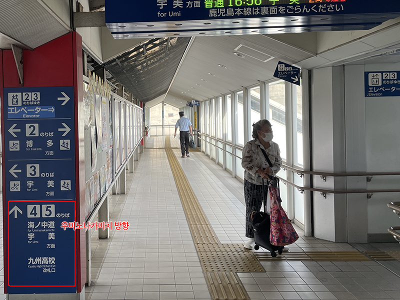 계단을 올라가면 4,5번 플랫폼이 우미노나카미치 방향이라고 표시되어 있으니 4,5번 플랫폼으로 이동합니다. 4,5번 플랫폼은 제일 끝이니 끝까지 걸어가서 계단으로 내려가면 됩니다.