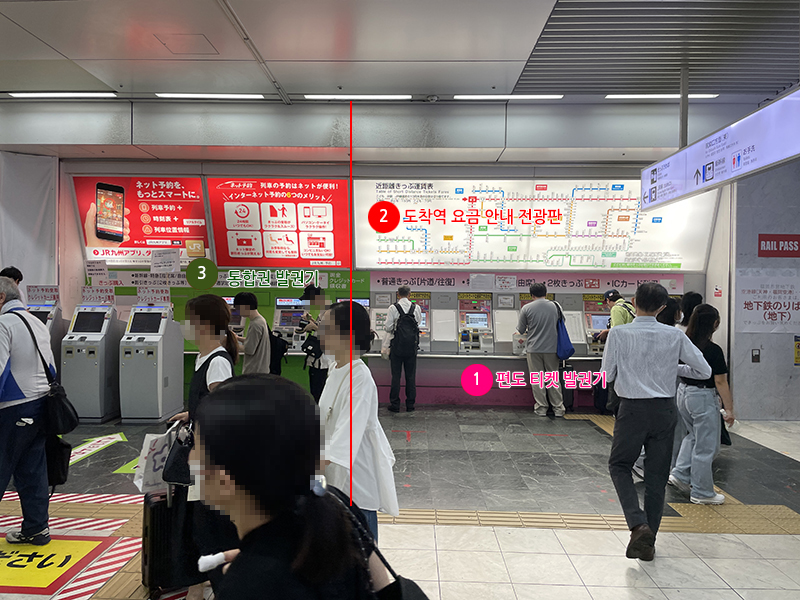 하카타역으로 들어가게 되면 JR 라인 기차표를 티켓팅 할 수 있는 무인발권기가 있습니다. JR선과 지하철은 다르기 때문에 지하가 아닌, 하카타역 1층에서 발권기를 찾으면 됩니다.