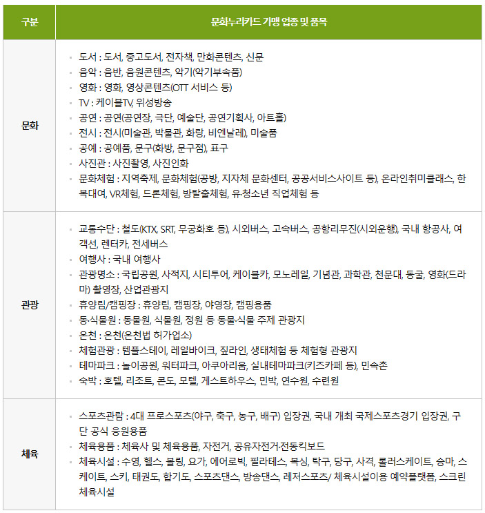 문화누리카드는 공연·영화·전시 관람을 비롯해 국내 여행, 4대 프로스포츠 관람(축구, 농구, 야구, 배구) 등 문화예술·여행·체육의 다양한 분야에서 사용하실 수 있습니다.