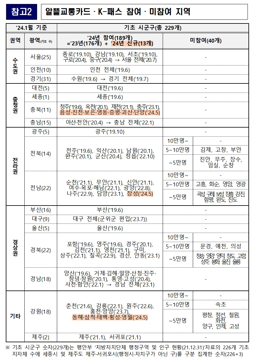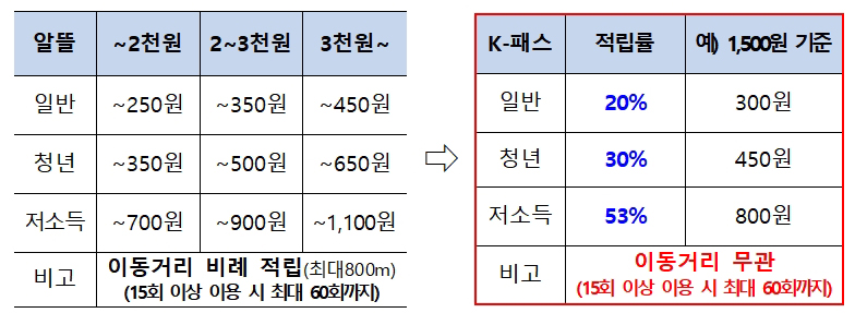 | 교통수단 | 전국 모든 교통수단 | 지하철, 버스, 마을버스 | 전국 모든 교통수단 |