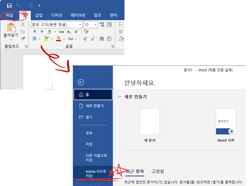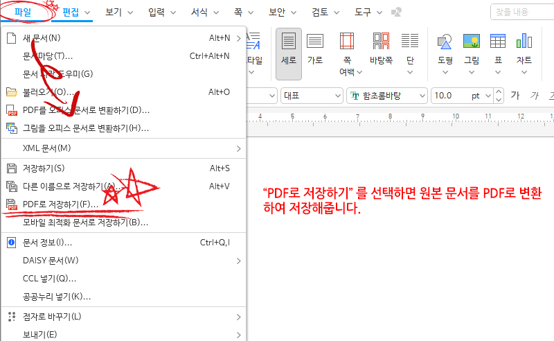 ③ "파일" → "PDF파일로 저장" 을 클릭하면 파일을 PDF파일로 변환하여 저장해줍니다.